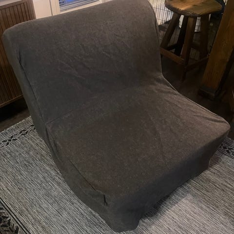 Tumma, lähes musta Ikean keinonahkainen kulmanojatuoli, jossa hyvä varavuode. Istuinosassa pieni vekki, joka ei näy käytössä eikä ole suurentunut. Hyvä nukkua ja siisti muilta osin. Kuva virheestä.