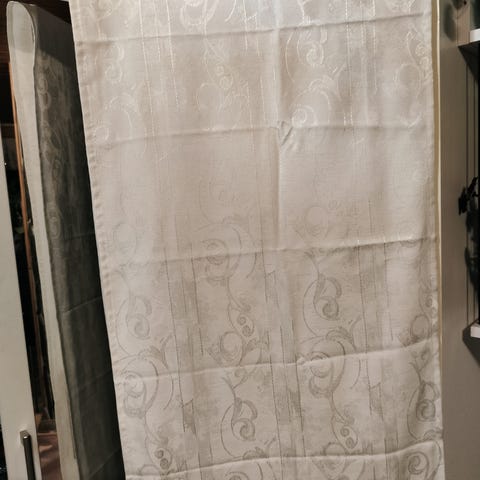 Verhot, jossa on kukkakuvio. Kangas on luonnonvaalealla pohjalla ja siinä on vihreitä lehtiä sekä punaisia ja keltaisia kukkia. Melko paksua kangasta.