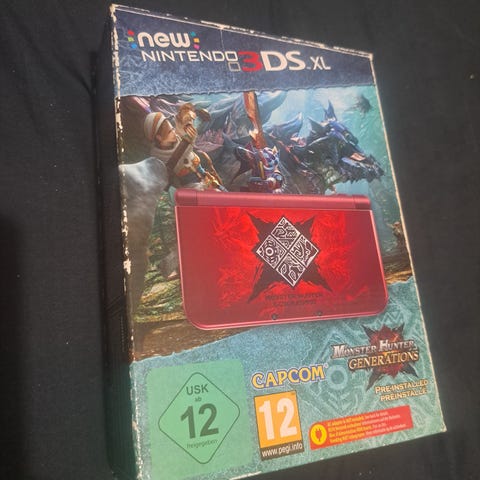 Uusi ja avaamaton New Nintendo 3DS XL -pelikonsoli (The Legend of Zelda: Majora's Mask-versio. Mukana ennakkotilaajan kylkiäinen, Majora's Mask-lasikoriste kankaisessa pussissa. PAL/EU-alueen julkaisu.