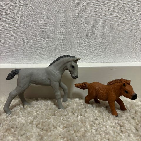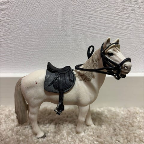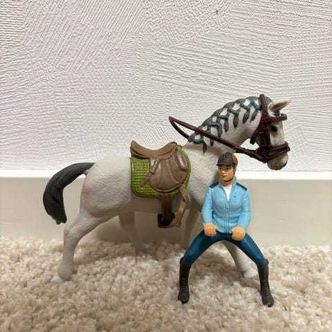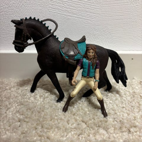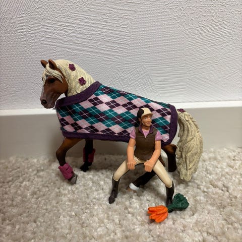 Hevosen ja ratsastajan lelusetti, jossa ruskea hevonen mustalla harjalla ja ratsastaja purppuranvärisissä vaatteissa. Soveltuu leikkeihin ja keräilyyn.