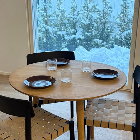 Tukevarakenteisessa massiivitammisessa pöydässä on viistot jalat ja pöytälevy, jonka alareuna on viistottu. Suunitelija Sami Kallio