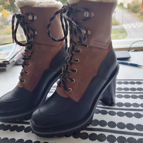Uudet käyttämättömät. Tytölle liian pienet siksi käyttämättömät. Uusien hinta 80 e. Korkea pohja . Karva vuori.