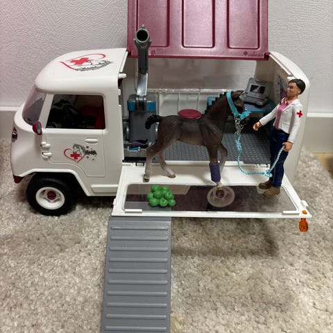 Schleich Playmobil hevosenhoitosetti sisältää hevosen, hoitajan hahmon, varusteita kuten satulan, kaviokuljetustelineen, harjan ja muita hevosen hoitoon liittyviä tarvikkeita. Setti on tarkoitettu leikki- ja keräilykäyttöön.