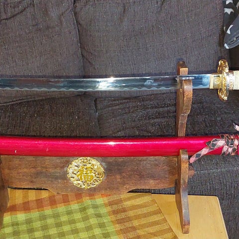 Miekka valkoisella tupella ja koristeellisella kantopussilla. Sopii esimerkiksi harrastus- tai koristekäyttöön tai leikkuutestiin.