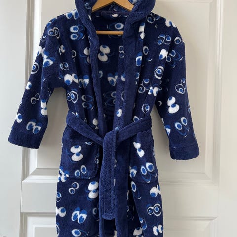 Hyvässä käytetyssä kunnossa oleva kylpytakki koko 116. Mitat: olka-helma 73cm, kainalo-kainalo 44cm ja kainalo-hiha 28cm. Lisäkuvassa näkyy myös muita vaatteita samassa koossa. Voin postittaa. Postit lisätään hintaan.