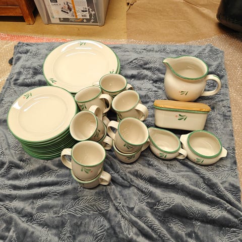 Myydään kuusi teekuppisettiä. Sisältää aluslautaset/tassit sekä kakkulautaset. Kuin uudet. Tämä on se teekuppikoko, mutta käy hyvin kahvikupista. Viimeisessä kuvassa vielä mukana myynnissä oleva voin säilytysrasia. Hinta koko paketille.