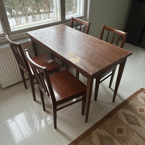 Vanhat tuolit ja pöytä, vaaleansininet, maali hieman rikkoilee. Meillä ollut käytössä näin, mutta miksei voi myös tuunata.