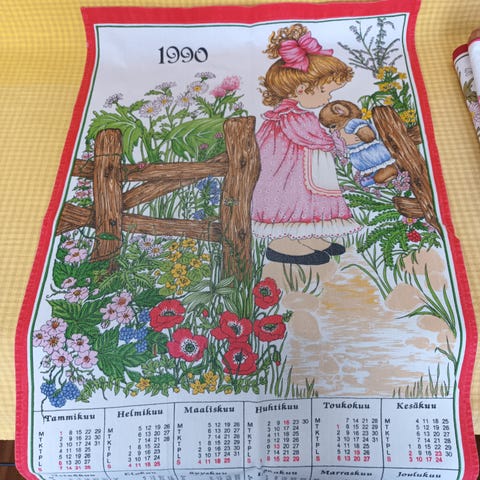 Kalenteripyyhe 1991. Pieni reikä, mutta ei kovin näkyvä.