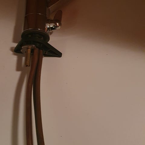 Oras Cubista keittiöhana. Astianpesukoneen venttiili ei toimi, tai siis toimii, mutta ainoa "asetus" on auki. Venttiilin säätöpainikkeen päällä ollut musta pyöreä sormenpään kokoinen tarra on hävinnyt.