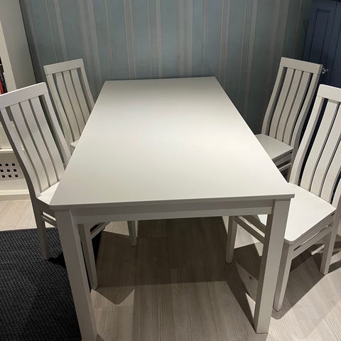 Myydään Pohjanmaan Aava-ruokapöytä sekä 6 kpl Meri-tuoleja. Pöytä on maalattua massiivikoivua, pöytälevy mdf:ää. Tuolit ovat maalattua massiivikoivua verhoillulla istuimella. Istuimen väri meleerattu tummanharmaa.