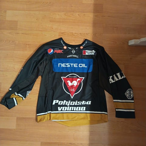 Game worn hyvällä wearilla. Etupuolella kärppäpelaajien nimmareita mm. Aho, J.Jokinen ja Rinne. Helmassa mm 2018 finaalipatch