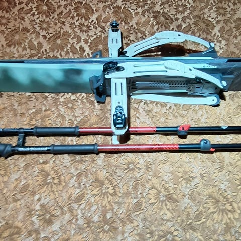 Muutaman kerran hiihdetyt Liukulumikengät+EA 2.0 siteet ja Tubbs alumiiniset teleskooppisauvat. Sauvat säädettävissä 105-130cm.