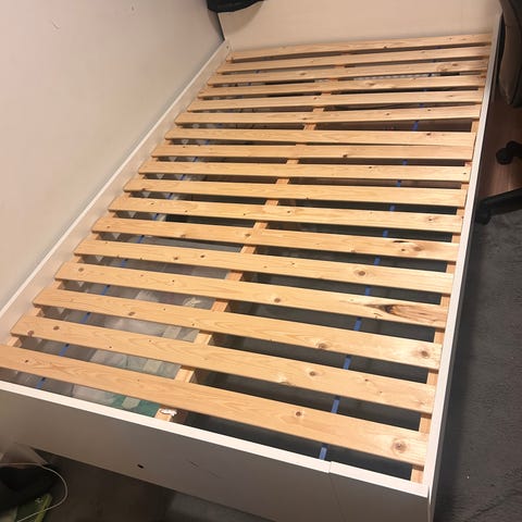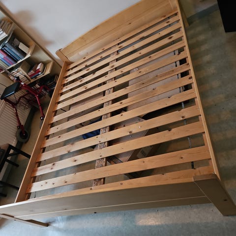 Täyspuinen, tukeva sängyn runko ja sälepohjat.