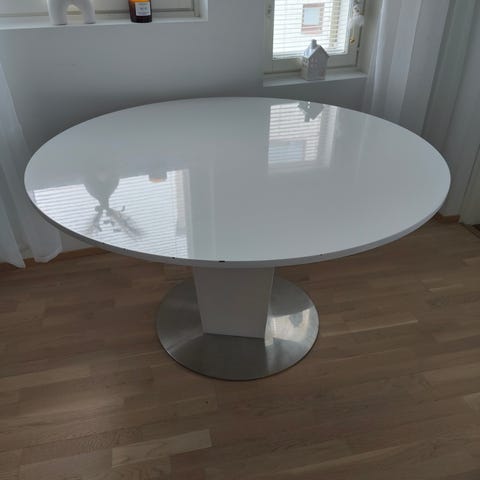 Pyöreä valkoinen ruokapöytä, jossa on puujalat. Mukana neljä valkoista tuolia, joissa on muoviset istuimet ja puujalat. Kalustekokonaisuus soveltuu ruokailuun tai oleskelutilaan. Noin 110cm. Keskellä pöytää pieni tahran jälki joka ei lähde pois.