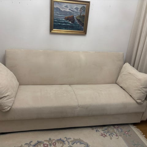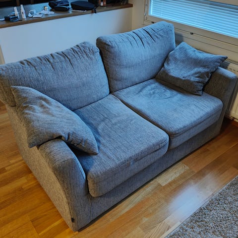 Sohva vuodesohva harmaa kangas. Sohvassa on vaurioita kulmissa, jotka näkyvät kuvissa. Sopii tilaan, jossa tarvitaan sekä istuma- että nukkumapaikka. 140x200cm