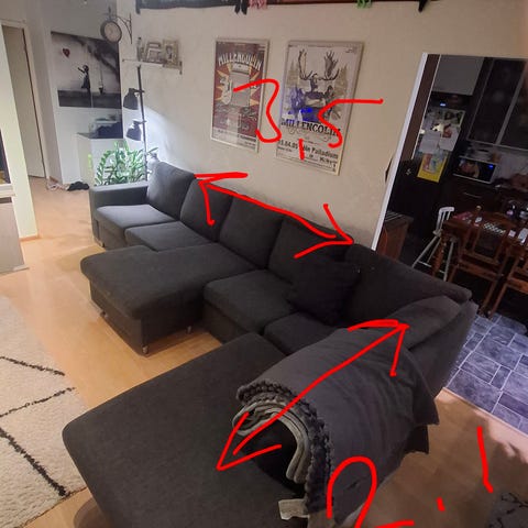 Iso vaalean harmaa U-mallinen sohva. Leveys on 300cm, pidempi kulma on 200cm ja pienempi kulma on 160cm.