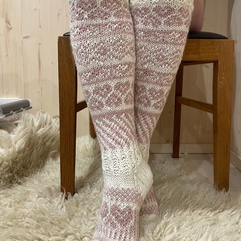 Käsinneulotut villasukat, joissa on monivärinen kuviointi. Sukat ovat nilkan korkuiset ja valmistettu villalangasta. Sopivat käytettäväksi viileissä olosuhteissa lämmittämään jalkoja.