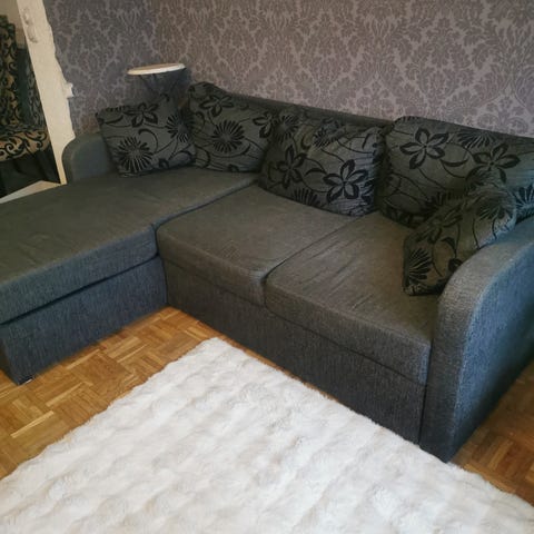 Divaaniosassa säilytyslaatikko. Saa levitettyä myös vuodesohvaksi mutta alapuolen vanerissa halkeama joten ei kestä kovaa painoa. Tämäkin varmasti korjattavissa tukipuulla tms mikäli haluaa hyödyntää vuodeominaisuutta.