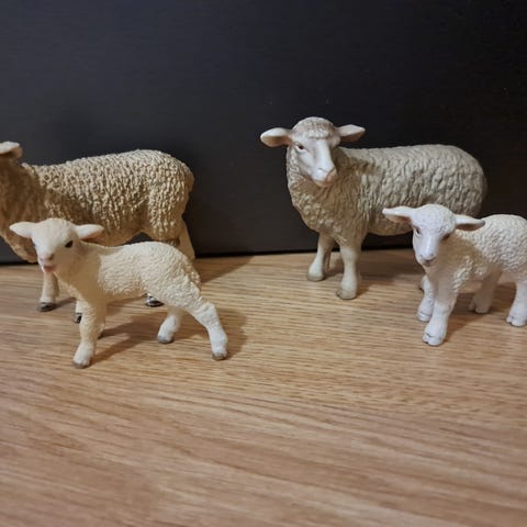 Schleich eläinhahmot, joissa on kaksi lammasta, yksi ruskea ja yksi musta. Pienikokoiset ja sopivat esimerkiksi leikkeihin tai kokoelmiin.