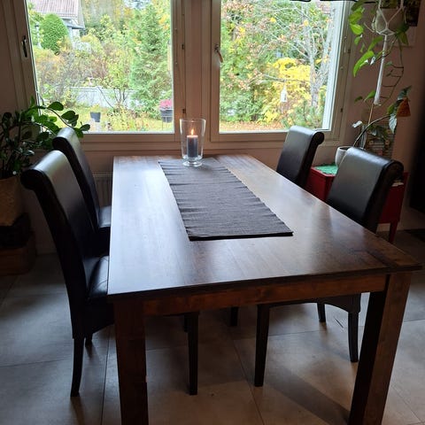 Pohjanmaa puinen ruokapöytä, jossa musta kansi ja valkoiset jalat. Tuolit 6 kpl (kuvassa 4) kankaisella istuinosalla ja puu jaloilla. Pöytä soveltuu ruokailuun ja muihin kodin käyttötarkoituksiin. Pöydässä näkyy käytön jälkiä pinnassa, sekä tuolin jalassa. Osat puuta joten käytön jälkiä pystyy korjaamaan.