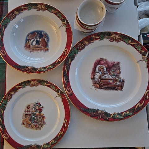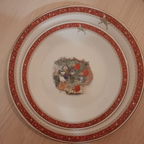 Kaksi "Pluto ja joulukuusi" lautasta erittäin hyvässä kunnossa, isompi halkaisijaltaan 27cm ja pienempi 21cm