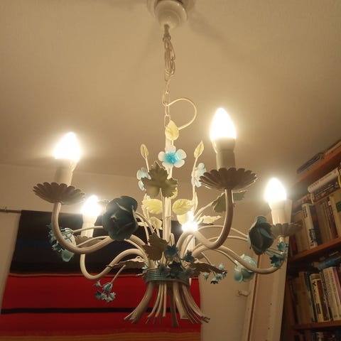 Kaunis valkoinen kattokruunu. 5-haarainen kattolamppu jossa on kauniit metalliset kukka ja lehti -koristeet. Kukat ovat pieniä kellokukkia. Jokaisen lampun varressa on kukkia, ja ylör kattoon menevässä rungossa on myös metalli varsilla kiinni kello -kukkia. Kattovalaisin on täysin ehjä, ja toimiva. Siisti kunto, valkoinen ja vaalean sininen maali pinta on hyvässä kunnossa. Lamppu on 70 cm korkea ja noin 50 cm leveä. Korkeus on säädettävissä pidemmäksi tai lyhyemmäksi lampun säätö ketjun avulla. Ketju on tarpeeksi pitkä jotta lamppu sopii huonekorkeudeltaan standardia korkeampaan huoneeseen, esim. mökki ja maatila ruokasalin ruokapöytä päälle kiinnitettynä korkealle kattoon asennettuna. Valaisin on Helsingissä.