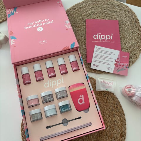 Dippi kynsilakkajärjestelmä sisältää useita kynsilakkoja, kynsiharjan ja muita tarvikkeita. Pakkaus sisältää säilytys- ja käyttöohjeet. Tuote on tarkoitettu kynsien koristeluun ja hoitoon.