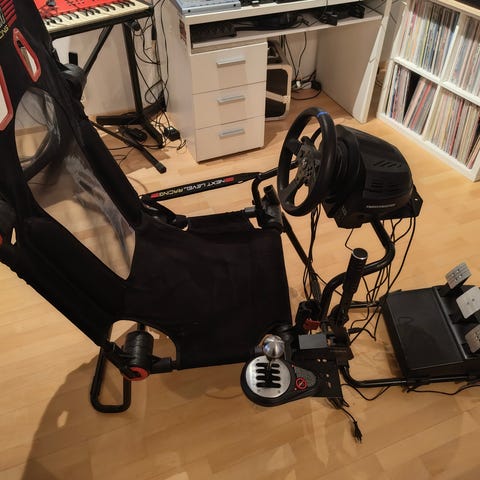 Thrustmaster t248 ratti- ja poljinsetti, sekä RS-racing rallipenkki, jonka etäisyyttä, sekä kulmaa saa säädettyä juuri itselleen sopivaksi.