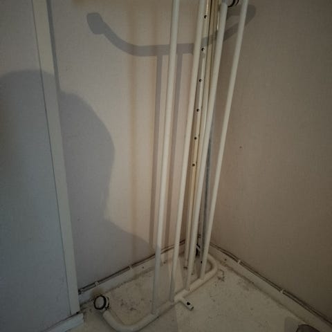 Annetaan puinen vaaterekki, josta yksi säle irronnut alatasosta. Rekki on hyväkuntoinen, mutta pari ruuvia kiinnitetty lisäkoukuiksi. Tästä tosi hyvä kaluste vielä hyvään käyttöön.