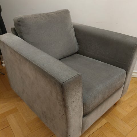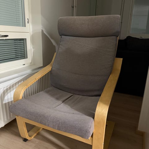 IKEA nojatuoli, harmaa väritys. Sopii istuimeksi olohuoneeseen tai muuhun tilaan. Käsinojat molemmin puolin, pehmustettu istuin ja selkänoja.