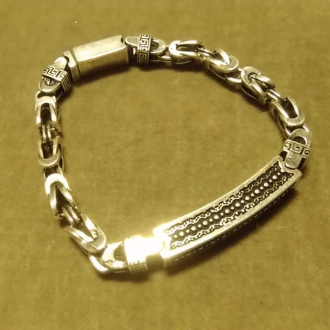 Miesten rannekoru seosmetalli.Pituus 23cm,leveys 8mm,paino 35g.Hinta: 13€ sisältää lähetyskulut.