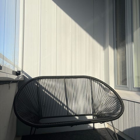 Selling a balcony set in good condition as it is not needed. The set includes a table, a bench and two chairs, with metallic sides.