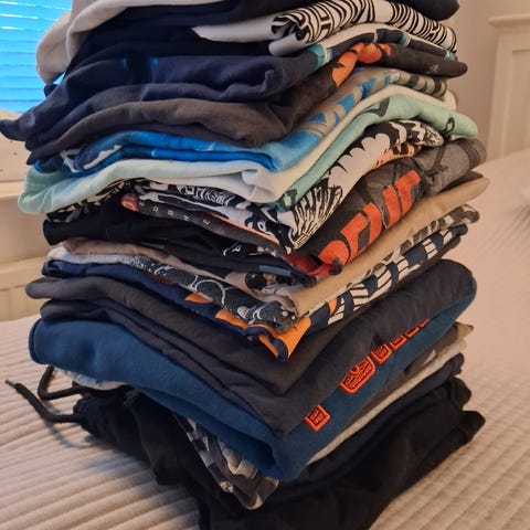 Vaatepaketti. Kokona 134/140. 3kpl pitkähihaisia, pitkähihainen tunika, keltainen shortsi/mekkoasu, mustat reisitaskuhousut, lilat kesähousut, siniset löysät housut ja siihen toppi, popin raidalliset yökkärit ja lilat yöhousut.