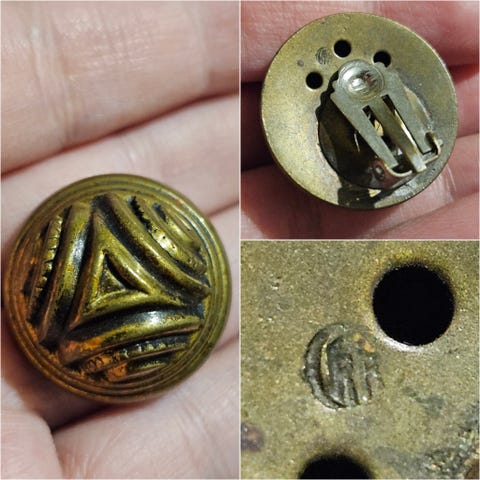 Pronssinen Kalevala Petsamon Kolttakoru korvakoru vihreällä kivellä jossa on reilusti ajanpatinaa ja puuttuu osia