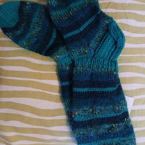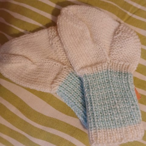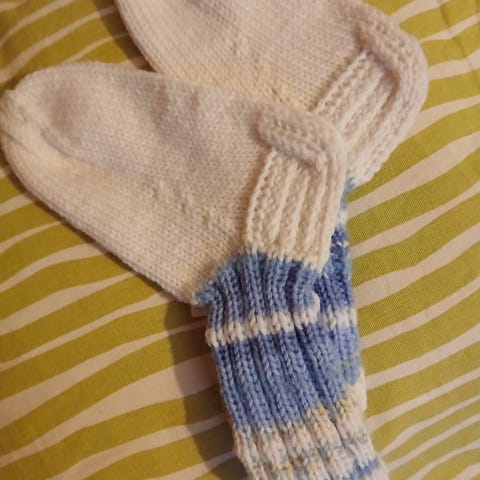 Lämpimin ajatuksin neulotut vaaleat ns junasukat, jotka pysyvät hyvin pienissäkin jaloissa, pohjan pituus 10 cm. Hinta 10 e + postimaksu 2,75 e. Lähetän sukat sinulle, voit maksaa tililleni saatuasi ne.