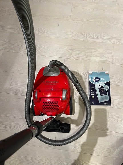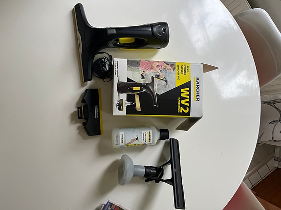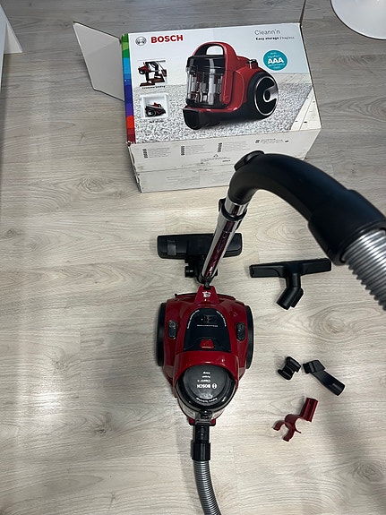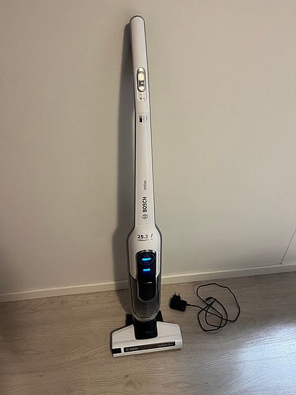 Erittäin siisti varsi-imuri laturin ja kahden lisäsuulakkeen kera.