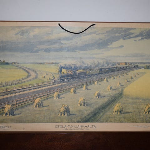 Koko 56 x 95 cm. Ajan patinaa yhdessä nurkassa kulumaa, muuten hyvä kunto.
