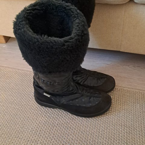 Mustat Kuoma-talvikengät, joiden yläosa on kiiltävää, tikkikuvioitua ja vettähylkivää tekstiiliä ja alaosa mokkanahkaa/nukkapintaa. Kengissä on paksu ja lämmin vuori sekä varren suulla kiristysnyöri. Tukeva pohja tarjoaa pitoa talviolosuhteisiin.Valmistaja: KuomaKoko: 39Väri: mustaMateriaali: tekstiili ja mokkapinta, pohja kumia