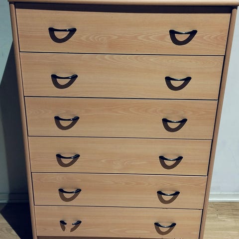 Lipasto 5-laatikolla.. korkeus 110cm. Lipasto ollut meikkikaappina, joitakin meikin tahroja laatikon sisäpinnoissa.