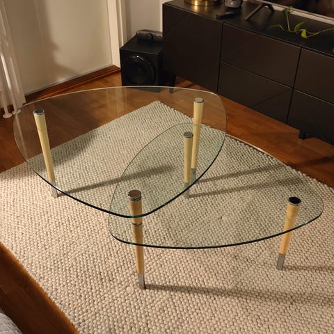 Hyvä kuntoinen sohvapöytä. Lasikannen alla laatikko jossa 4 lokeroa.