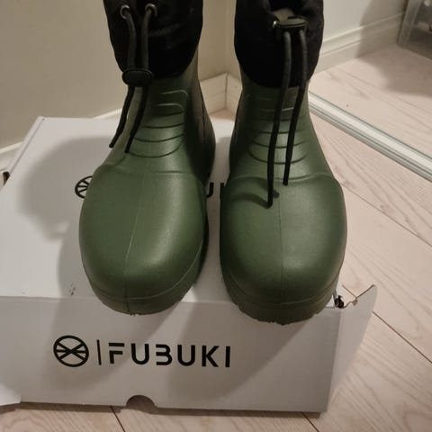 Fubuki kumisaappaat, koko 43. Saappaat ovat vihreät ja valmistettu kumista. Saappaissa on säädettävä kiristysnauha varren yläosassa. Sisävuori on pehmeä ja lämpöä eristävä. Saappaat soveltuvat kosteisiin ja märkiin olosuhteisiin.