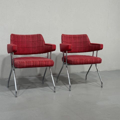 Aarne Ervin suunnittelemat punaiset Merivaara-tuolit, joissa on metallijalat ja verhoiltu punaistuin hienoilla nahka käsinojilla. Kuntohuomio huomioitu hinnassa