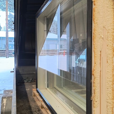 Vähän aikaa käytössä ollut Ikkuna karmeineen, alumiini ulkopuoli, kokovalkea, valmistaja Skaala.