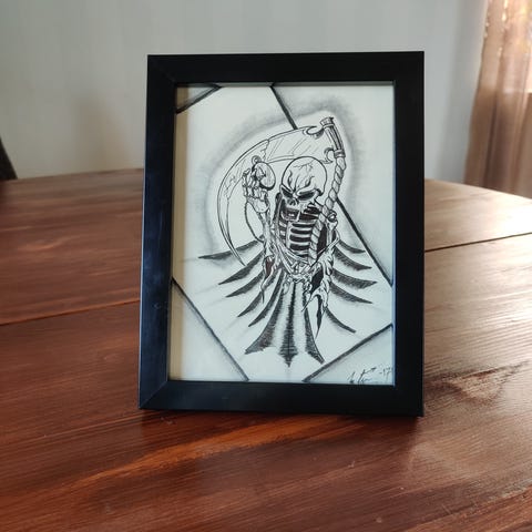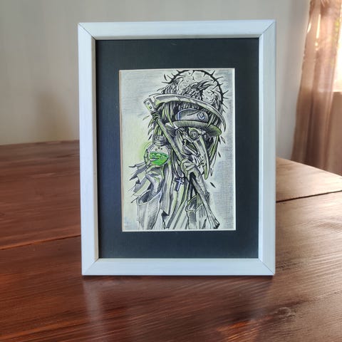 Plague Doctor – käsin piirretty taulu kehyksissä (21 × 27 cm) – uniikki