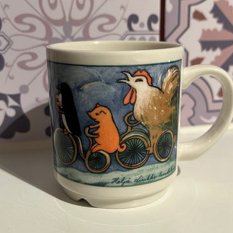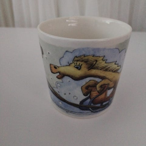 Arabia Yhteispelillä muki. Korkeus 7.3 cm, halkaisija 7.5 cm. 15 euroa Nouto Vantaalla Hiekkaharjussa.