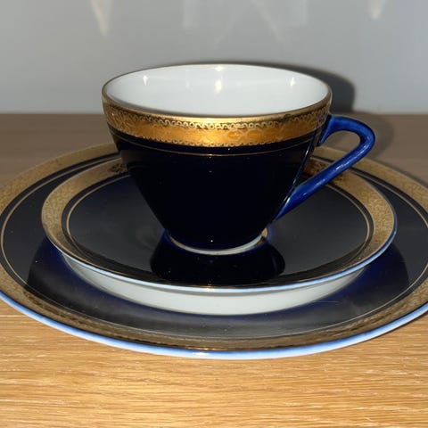 USSR Tee tai kahvikuppi ja lautanen, joissa sininen väri ja kultakoristeet. Materiaalina posliini. , kupin ja siihen sopivan lautasen n. 14,5 cm ja kuppi 7x9cm