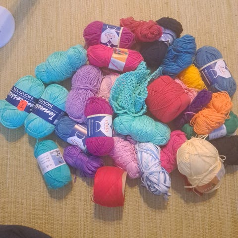 Puuvillalankoja erivärisiä, osasta hieman käytetty mutta lähes täysiä keriä.