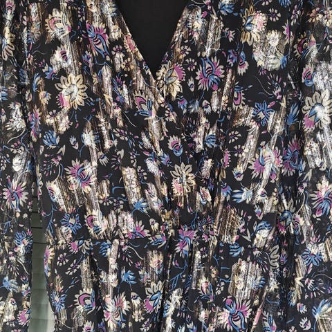 Liz Lisan harsomainen vaaleanpunainen mekko, jonka printissä brändin tunnusomaiset ruusut. Olkapääillä harsoröyhelöt, jotka muistuttavat terälehtiä. Hyvin kevyt ja päällä miellyttävän pehmeä malli. Vastaa Suomen kokoa S, mutta vyötärö antaa enemmän periksi kuin brändille on tyypillistä. Hyväkuntoinen.