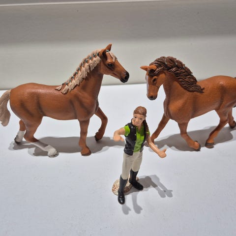 Schleich hevonen, tarvikkeet ja Papo ratsastaja (huom. yksi käsi rikki)