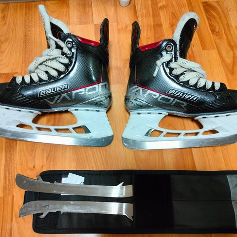 Bauer luistimet, kunto hyvä, koko 38-39 hinta 15€. Jääkiekkomailoja, pari komposiittia, loput puumailoja, kaikki yht. 45€